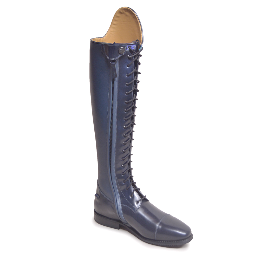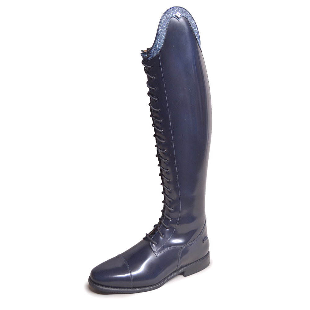 This Particular Tintoretto Brushed Blue Leather Boot, with inside leg in 91 Do Blue. Completed with G9 rondine top shape in Iride Blue. Laces on eyelets. The Tintoretto model features a Soft Vitello leather inside leg section. All boots come with Vibram Soles. This design features the Black Vibram sole. All price are not including any additional spur rests that may be shown on images. These can be added on the boot builder. The Bellini Boot is available in multiple colours and a selection of choice of tops. You can customise the top of the boots with leather tops and add any additional extras on the boot builder.