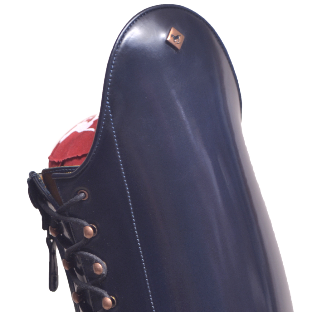 This Particular Tintoretto Brushed Blue Leather Boot, with inside leg in 91 Do Blue. Featuring rose gold hardware. The Tintoretto model features a Soft Vitello leather inside leg section. All boots come with Vibram Soles. This design features the Brown Vibram sole. All price are not including any additional spur rests that may be shown on images. These can be added on the boot builder. The Bellini Boot is available in multiple colours and a selection of choice of tops. You can customise the top of the boots with leather tops and add any additional extras on the boot builder.
