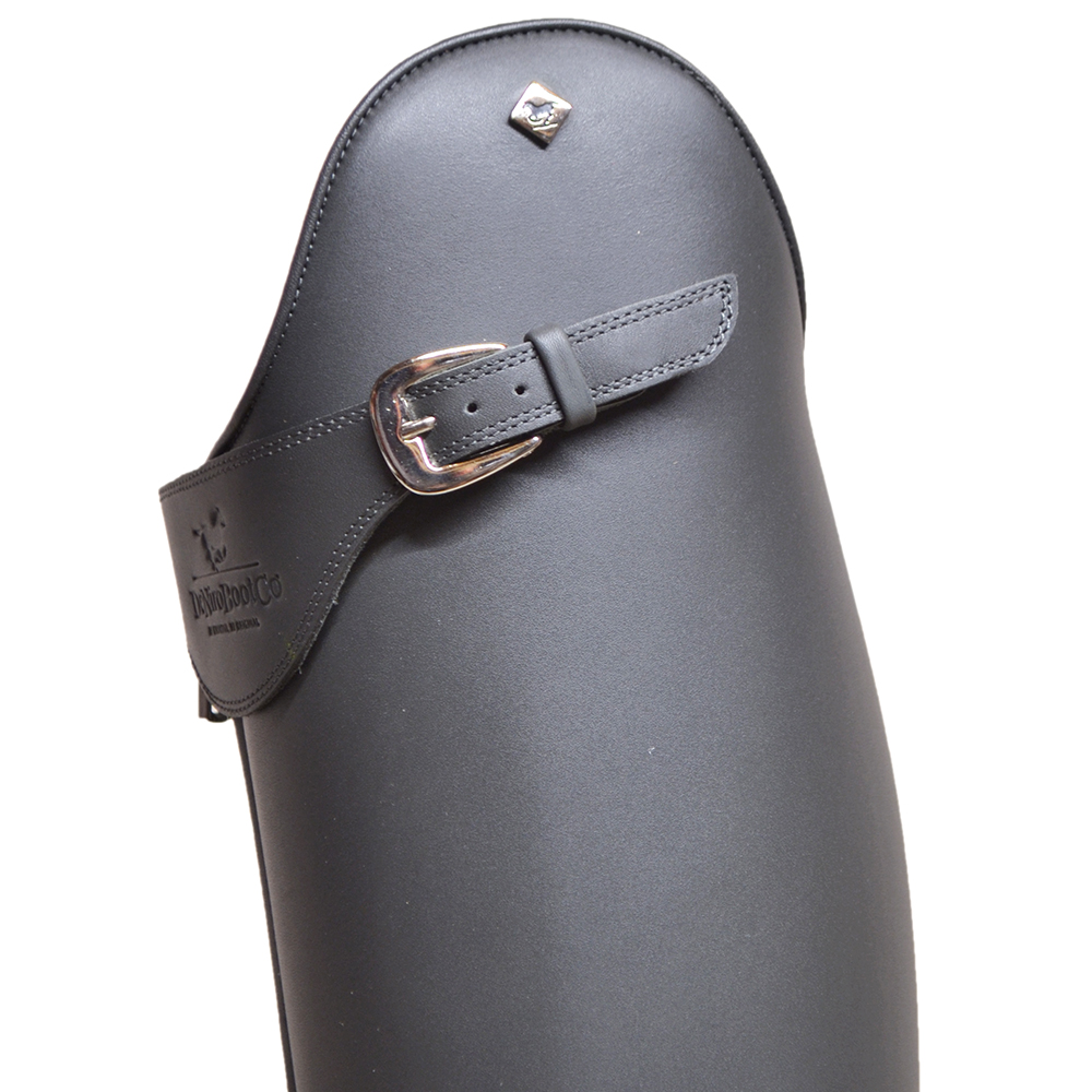 This Particular Bellini De Niro Boot features an Anthracite Grey Leg, foot and inside leg. This particular design features a curved top strap with antique brass buckles and punched hole details over the toe. All boots come with Vibram Soles. This design features the Black Vibram sole. All price are not including any additional spur rests that may be shown on images. These can be added on the boot builder. The Bellini Boot is available in multiple colours and a selection of choice of tops. You can customise the top of the boots with leather tops and add any additional extras on the boot builder. The Bellini Boot is a rigid Dressage boot.